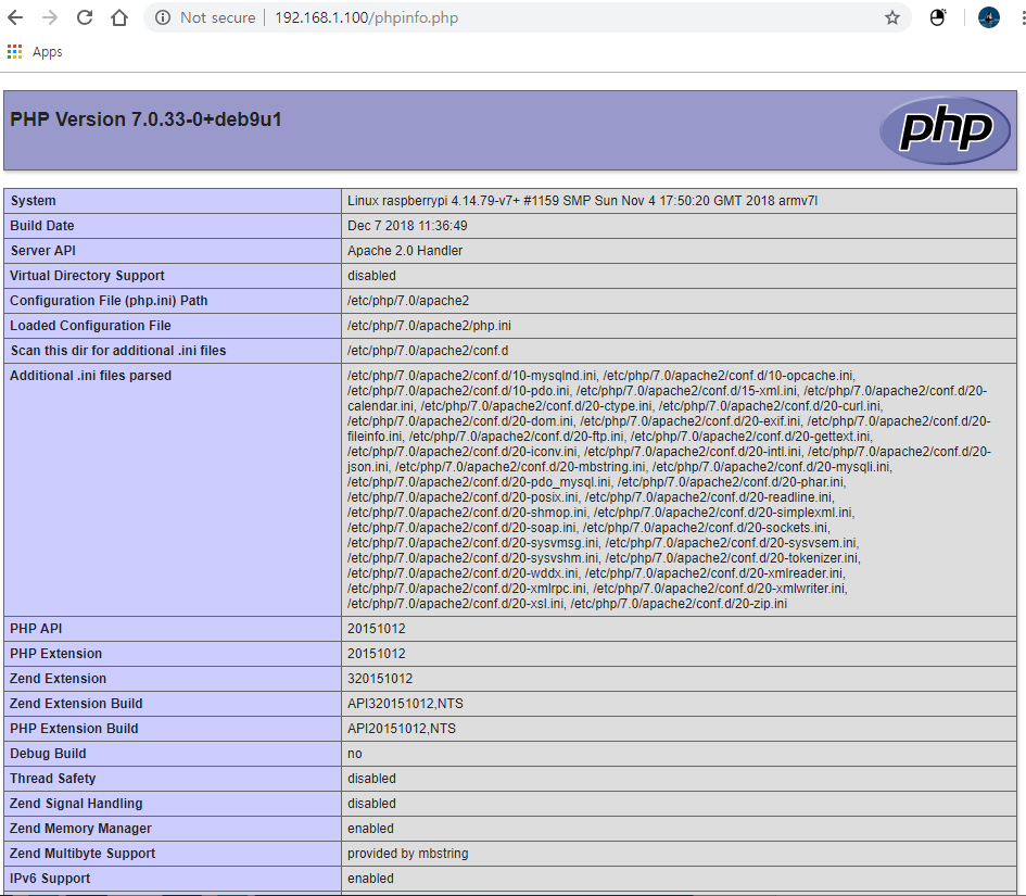 웹브라우저 검색창에 "http://라즈베리파이 IP주소/phpinfo.php"를 입력하면 설치된 php 정보를 볼 수 있습니다.