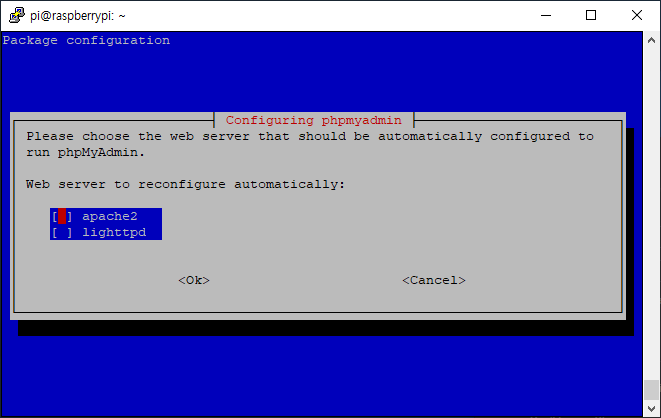 phpMyAdmin를 자동적으로 구성하기 위한 웹 서버를 선택해줍니다. 이 글 기준 apache2를 선택하면 됩니다.