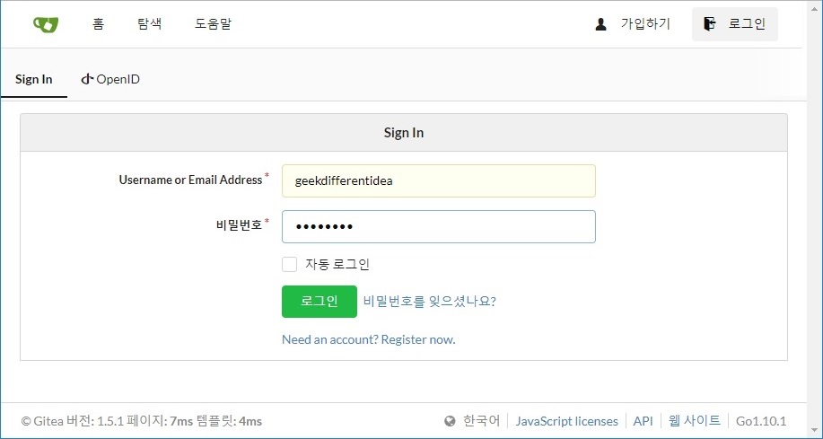 gitea 설치가 완료되면 가입하기를 눌러서 gitea에서 사용할 계정을 생성합니다.
